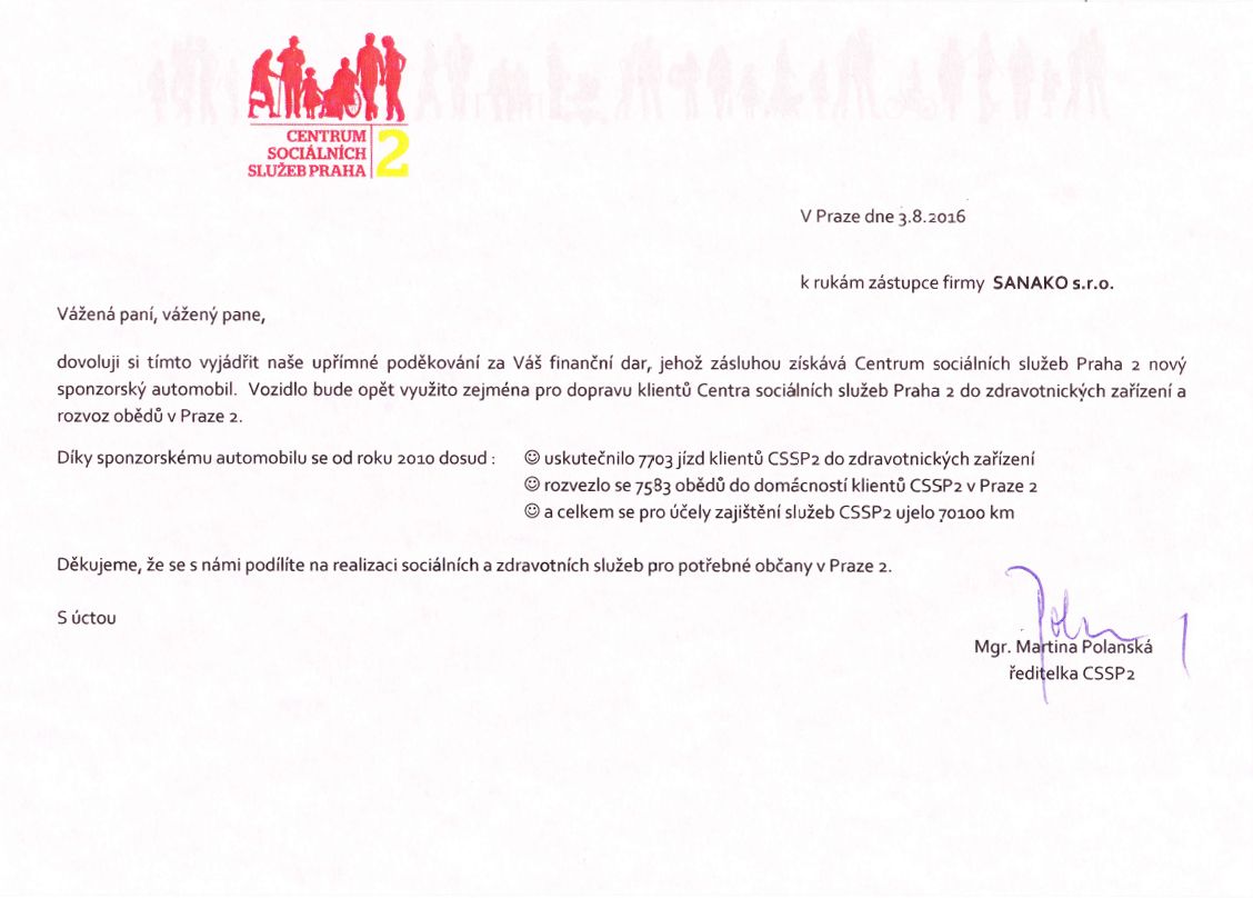 - Pomáháme potřebným – poděkování z Prahy 2 za finanční dar.